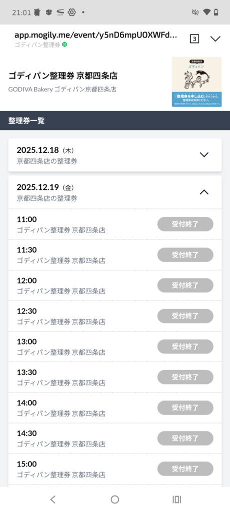 ●整理券は1分でなくなる(2025年12月18日現在)整理券の取れるコツを教える この画面時間帯の書かれた画面で待機する 21:00ちょうどにボタンを押す そして次に開くページの下らへんにボタンがあるためすぐに押す そしてなにより人気の時間帯は避ける事