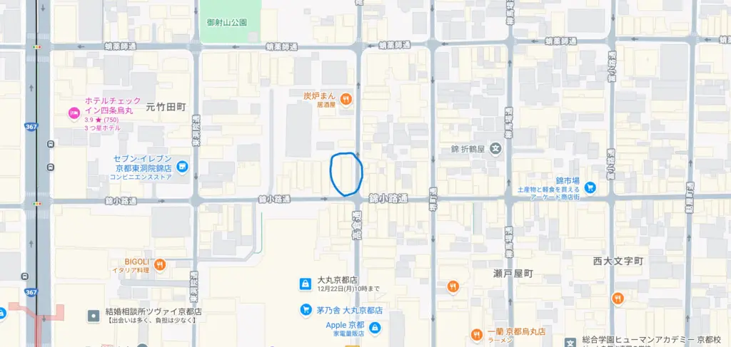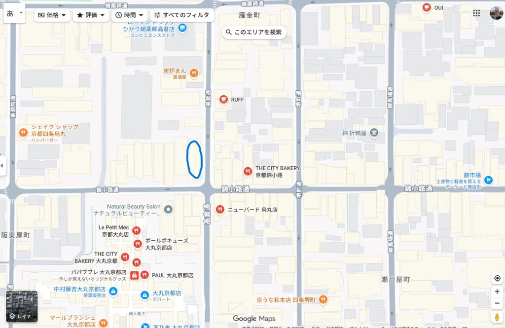 青い○で囲った:ゴディパン 赤い印:周りに存在するパン屋、カフェ