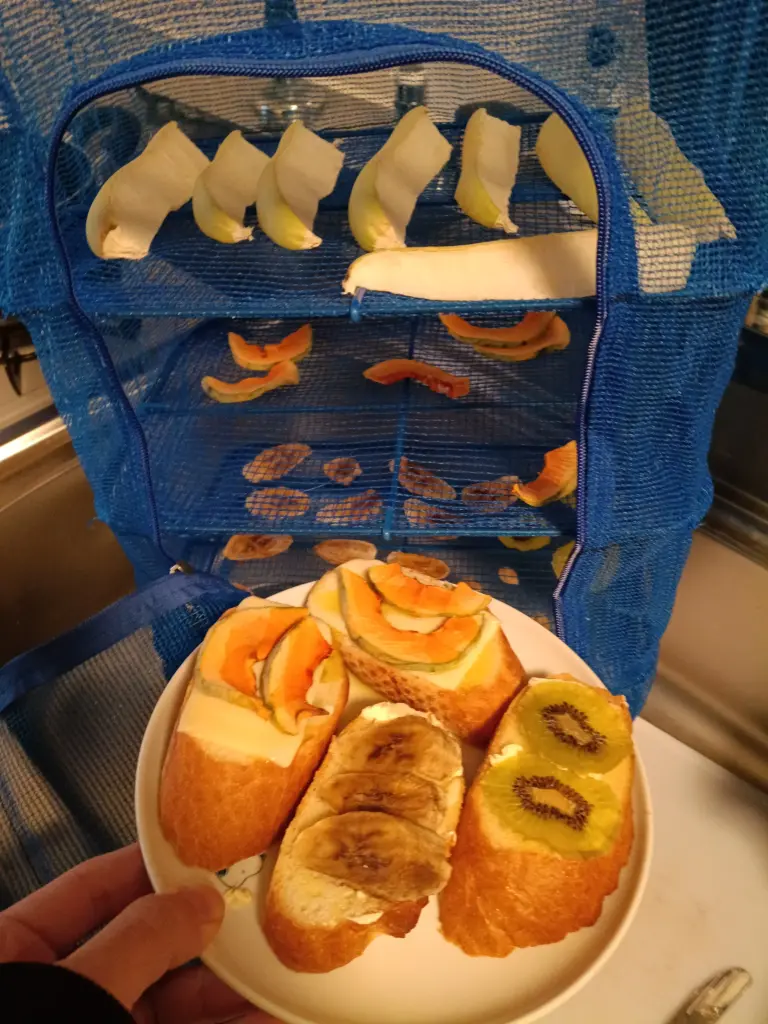 - 変色を防ぐ: りんごやバナナは、干す前に塩水やレモン汁にくぐらせると、茶色くなるのを防げます 基本的に茶色くなってもおいしいです