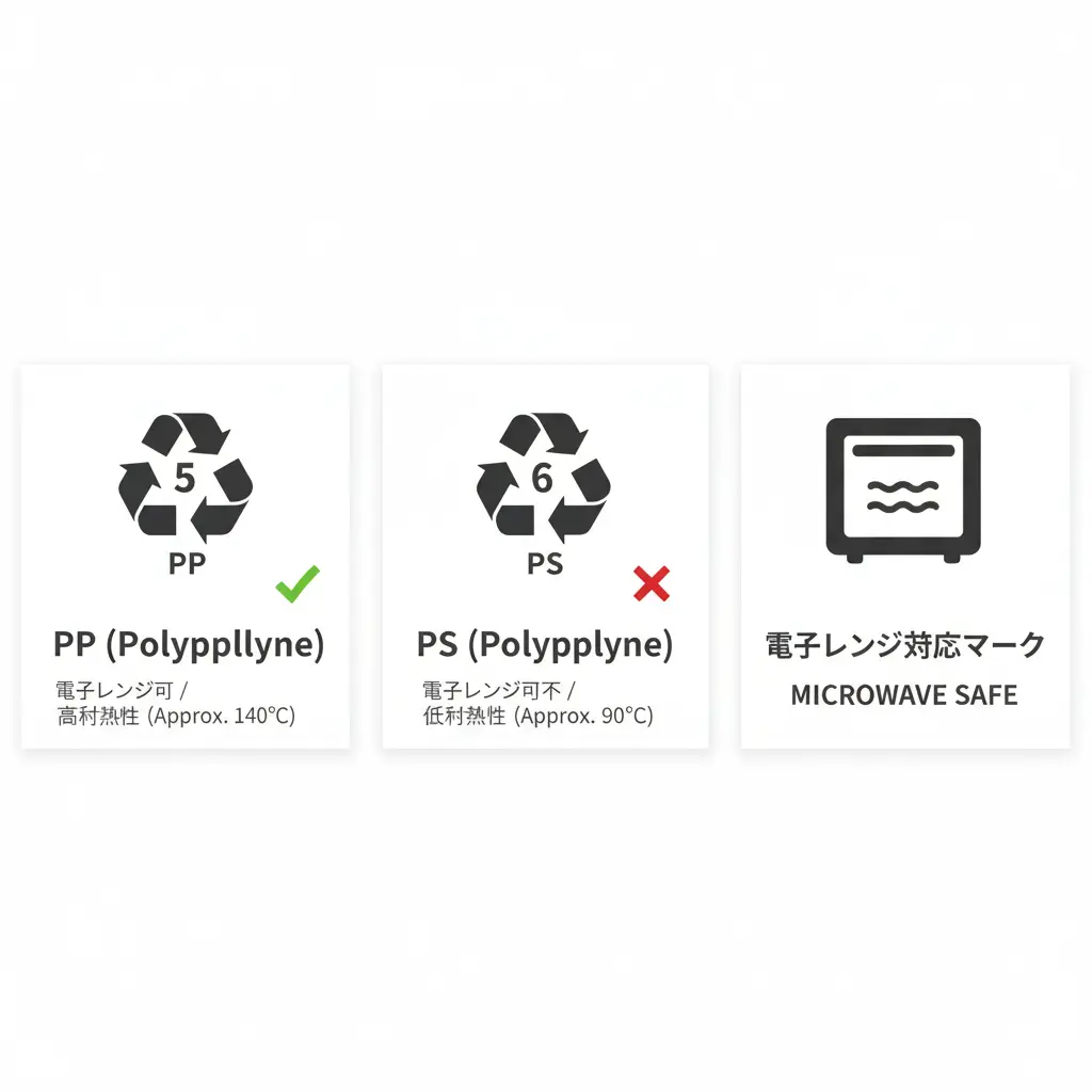 まず探すべきは「PP」という文字。これはポリプロピレンの略で、耐熱温度が約110〜140℃と高く、デリバリー容器の中では「電子レンジOK」の代表格です